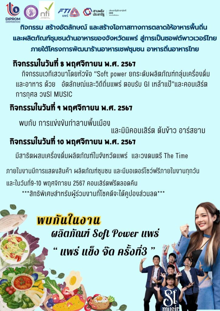 ขอเชิญชวนร่วม กิจกรรม “สร้างอัตลักษณ์ และสร้างโอกาสทางการตลาดให้อาหารพื้นถิ่น และผลิตภัณฑ์ชุมชนด้านอาหารของจังหวัดแพร่ สู่การเป็นซอฟต์พาวเวอร์ไทย” ภายใต้โครงการพัฒนาร้านอาหารเชฟชุมชน อาหารถิ่นอาหารไทย